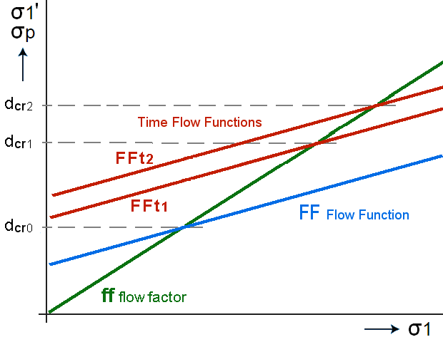 Time flow functionWhile we previously indicated the measured relationship between consolidation stress (sigma1) and unconfined yield strength (sigmaP) with the flow function FF, the influence of time is shown with the time flow function FFt. The duration of undisturbed storage is also important here, as a longer time will usually lead to greater strength. Thus, for time-sensitive products, we will need to have an impression already at the silo design stage as to whether and how long the product will be stored without extracting product from the silo.