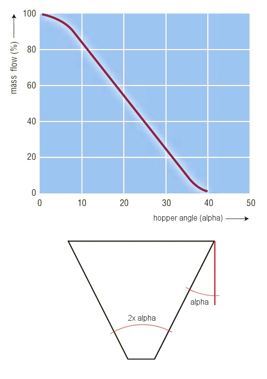 The sometimes heard remark that mass flow will always occur at a funnel angle of 30 degrees to the vertical (60 degrees to the horizontal; i.e. a top angle (enclosed angle) of 60 degrees) unfortunately does not always hold true.