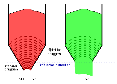 Theoretisch kan volledig uitstromen optreden wanneer de helling van de trechter iets groter is dan de wandwrijving tussen stortgoed en wand.